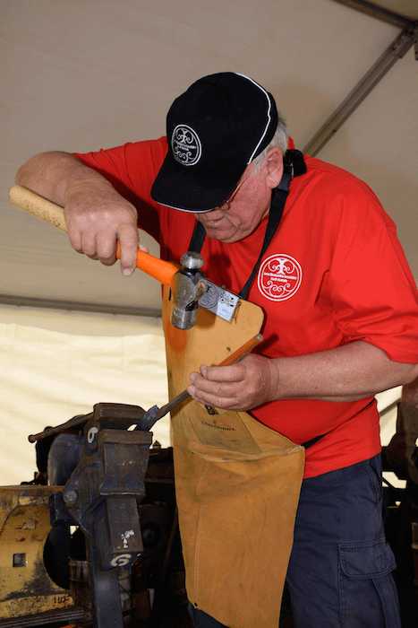 This year, the forging was spread into three areas. There was the main marquee with the project underway. A set of forges for the freestyle work and then the forges over in the original forge shop in the museum. This gave the public a good range of forging activities to observe, although some were mystified by the work in the main tent. Watching the forging and shaping of punches is a little out of the ordinary as an activity. There were a few smiths on hand to explain the process to the inquisitive on lookers.